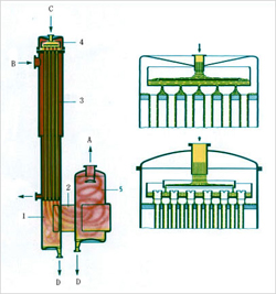 Rising film evaporator The rising film evaporator is also called a climb film evaporator. It operates according to the principle of the siphon pump. According to the lift of the steam bubbles generated during the boiling process, the liquid and the steam flow in parallel, and at the same time, the amount of steam generated increases, thereby A flowing membrane is created on the wall of the tube, ie the liquid "crawls up". The parallel flow movement is ribbed to create a high degree of turbulence in the liquid. This type of evaporator is characterized by a long heating tube (about 5 to 7 M), but the temperature difference between the heating chamber and the boiling chamber must also be large. Otherwise, the energy of the steam flow is insufficient to transport the liquid and produce a climbing film. . A:Material import B:Condensate outlet C:Condensate outlet D:Concentrate outlet E:Secondary steam outlet ![]() Falling film evaporator In the falling film evaporator, the liquid and the steam flow in parallel, the concentrated liquid is preheated to the boiling temperature, and the uniform liquid film enters the heating pipe through the liquid distribution device on the top of the evaporator, and flows downward at the boiling temperature. And partially evaporating, the gravity introduced by the downward movement is continuously strengthened by the cocurrent steam flow. In a falling film evaporator, it is extremely important to fully wet the liquid to heat the surface to face the trouble-free operation of the device. If the heating surface is not sufficiently wetted, local drywall and crusts will occur, and the bad condition is that the heating tube will be completely blocked. In critical cases, the wetting rate increases as the evaporator efficiency increases or divides, so the advantages of single pass operation should be maintained. In this mode of operation, the contact time of the liquid and the heating surface is almost constant, usually in the order of seconds. In addition to the tube size, the selection of a suitable liquid distribution device is important to achieve complete wetting. The following figures illustrate two liquid distribution devices. Due to the low amount of liquid in the heating tube and the fast flow rate, the product residence time is quite short, so that the heat sensitive material can be evaporated extremely gently. ![]() |