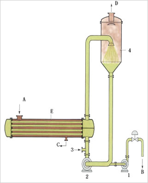 Self-circulating evaporator In a circulating evaporator, the liquid rises again into the overheating tube according to the principle of the siphon pump. In the separator connected thereto, the liquid is separated from the steam and flows back to the evaporator through the circulation pipe to form a closed circuit cycle. The greater the temperature difference between the heating chamber and the boiling chamber, the more steam bubbles are generated, which enhances the action of the siphon pump and increases the flow rate for good heat transfer. The standard evaporator is an old-fashioned circulating evaporator. A thicker circulation tube is installed at the center of the heating tube bundle, and the liquid level is higher than the upper tube sheet, so the amount of liquid is relatively high. ![]() Forced circulation evaporator Forced circulation evaporators are used to avoid fouling or crystallization of products boiling on the heating surface, for which reason the flow rate in the tubes must be high. The circulating liquid is heated as it flows through the heat exchanger and then partially vaporized as the pressure in the separator decreases, thereby cooling the liquid to a boiling temperature corresponding to the pressure. Due to the circulation pump, the operation of the evaporator is basically independent of the temperature difference, the recirculation rate of the material can be adjusted, and the evaporation rate is set within a certain range. In the crystallization application, the crystal can be adjusted by circulating flow rate and using special separation. The device design is separated from the circulating crystal slurry. The tubes can be arranged horizontally or vertically, depending on the conditions of the site and the requirements of the process, and in particular, when hot water is used instead of water vapor as the heating medium, a plate heat exchanger can be used. 1、Discharge pump 2、Discharge pump 3、Inlet 4、Splitter A、Heating steam inlet B、Concentrate outlet C、Condensate outlet D、Secondary steam outlet E、Heat exchanger ![]() Spiral tube evaporator Spiral tube evaporators are particularly suitable for achieving high concentrations and high viscosities. In order to achieve a high evaporation ratio, such evaporators operate at high temperature differences and in a single pass. In the spiral heating tube, the liquid to be evaporated flows from the top to the bottom, and at the same time, the boiling film flows in parallel with the steam. Since the heating tube is of course spiral shape, a long tube can be accommodated in a medium-high apparatus, after a long period of time. The steam generated in the flow of the pipe exerts a high shear force on the liquid film. For this reason, the curved spiral tube will cause a secondary flow, which is applied to the flow along the tube axis, which promotes turbulence and enhances heat transfer in the case of high viscosity. ![]() |